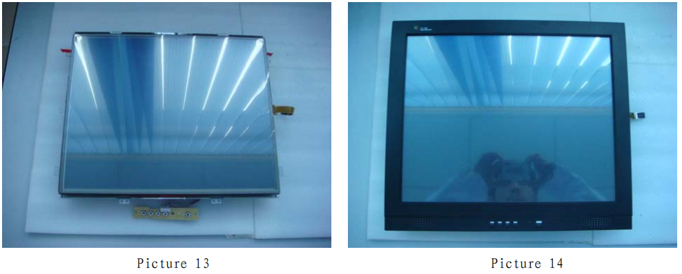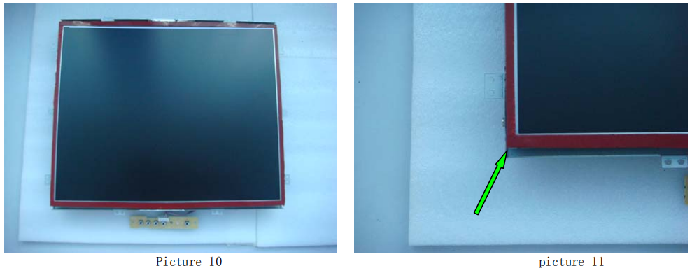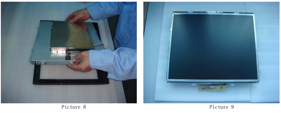 4.Please take off LCD Module(Like picture 8) and keep it in the safe as Picture 9 showing. Then be careful to attach double glue tape to the four side of the monitor.(Like picture 10). And Please remember that don’t stick the double glue tape on the touch area.(Like picture 11).