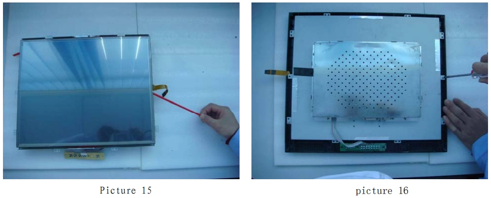 4.Please take off LCD Module(Like picture 8) and keep it in the safe as Picture 9 showing. Then be careful to attach double glue tape to the four side of the monitor.(Like picture 10). And Please remember that don’t stick the double glue tape on the touch area.(Like picture 11).